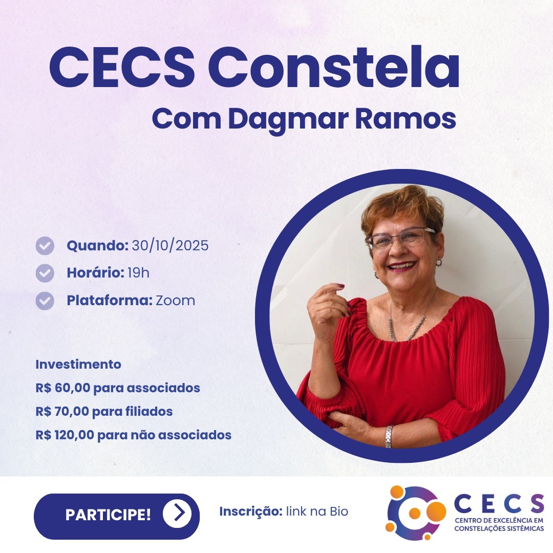 “CECS Constela” propõe espaço de prática, aprendizado e troca entre profissionais. Primeira edição acontece em 30 de outubro, com condução da presidente da instituição, médica Dagmar Ramos. A abordagem será sobre “Sintomas e Doenças”: olhar sistêmico sobre o corpo, a saúde e as manifestações físicas como expressões de dinâmicas familiares inconscientes