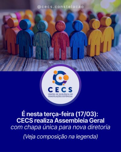 O Centro de Excelência em Constelações Sistêmicas (CECS) realiza nesta terça-feira (17/03), às 19h30, a Assembleia Geral Ordinária 01/2026 que marca o início do processo de votação para escolha da nova diretoria da instituição. A reunião ocorrerá em formato on-line, por meio da plataforma Zoom, com participação exclusiva de associados adimplentes, conforme prevê o Estatuto Social.